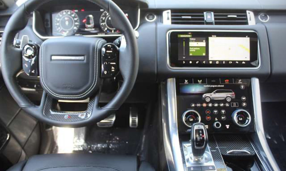 The 2022 Range Rover Sport SVR Carbon Edition is a high-performance, luxury SUV built on the SVR trim with extensive carbon fiber exterior and interior enhancements. It features a supercharged 5.0L V8 engine producing 575 horsepower, 0-60 mph in 4.3 seconds, and a top speed of 176 mph. Key features include a carbon fiber hood, carbon exterior trim, 22-inch gloss black wheels, enhanced SVR performance seats, and an SVR-tuned sport exhaust.
